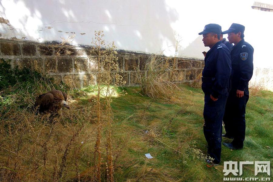 這只高山兀鷲翼展超1米(圖片由通訊員提供) 央廣網怒江2月6日消息(記者李騰飛 通訊員常國軒 茶學華)2月3日,怒江傈僳族自治州蘭坪縣森林公安局城郊派出所在縣城以北安置區救助了一只翼展超1米的國家二級保護動物高山兀鷲。 當日上午,蘭坪縣森林公安局城郊派出所接到群眾報警電話稱:“在蘭坪縣城以北安置區某一居民家房頂有一只雕,疑似翅膀受傷,無法飛行。”接到報警后,蘭坪縣森林公安局城郊派出所及時聯系縣林業局野保辦,并安排民警攜帶相關捕捉工具趕往現場進行救助,經初步確認該動物是一只國家二級保護動物——高山兀鷲。 高山兀鷲,別名坐山雕,為隼形目鷹科兀鷲屬大型鳥類,全長約90~1.2米,體重8~12千克左右,兩性羽色相似,羽毛顏色變化較大,成年兀鷲上體除翅、尾外褐白色,下體褐色,頭部和頭側裸露具絲狀羽毛,上體沙白色或茶褐色,具矛狀條紋及淡色羽緣。下體桂紅色但有白色條紋,頭部的絨羽漸為絲狀羽替代,頸部有很長的矛狀羽。嘴形高大而側扁,先端彎曲。嘴灰綠色或鉛灰色。腳暗綠灰色。 經森林公安和野保辦工作人員對高山兀鷲仔細檢查,發現高山兀鷲身上沒有明顯傷痕,但又不能起飛,為避免其再次受傷,森林公安民警與野保辦工作人員協商并將其移送至蘭坪縣新生橋管護站暫時救助,待放飛條件成熟后再放歸大自然。