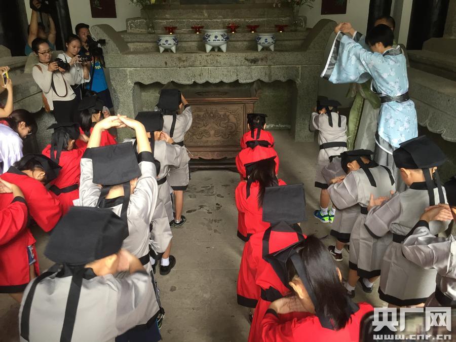 開(kāi)學(xué)第一課:江西白鹿洞書(shū)院迎來(lái)新生入學(xué)開(kāi)筆禮活動(dòng) 央廣網(wǎng)九江9月1日消息(記者謝元森 九江臺(tái)記者張國(guó)華)“冠必正,鈕必結(jié)、襪與履、俱緊切……”今天是中小學(xué)開(kāi)學(xué)第一天,在中國(guó)的四大書(shū)院之首的白鹿洞書(shū)院,伴隨著朗朗讀書(shū)聲,九江雙峰小學(xué)一年級(jí)的小朋友以開(kāi)筆禮活動(dòng)開(kāi)啟新生入學(xué)第一課。他們身著漢服,按照古代的開(kāi)筆議程,先行拜叩先師孔子,再開(kāi)展點(diǎn)朱砂、開(kāi)天眼的朱砂啟智、擊鼓鳴志活動(dòng)。在明倫堂,學(xué)生們?cè)诶蠋煹氖痉断乱浴叭恕弊譃閱⒚擅杓t,以從小樹(shù)立互相理解、互相支持、互相幫助,才能構(gòu)成和諧社會(huì)的價(jià)值觀。 -