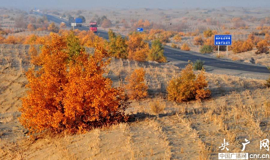 新疆第二條沙漠公路和田至阿拉爾公路旁的原始胡楊林(央廣網記者 張雷 攝)