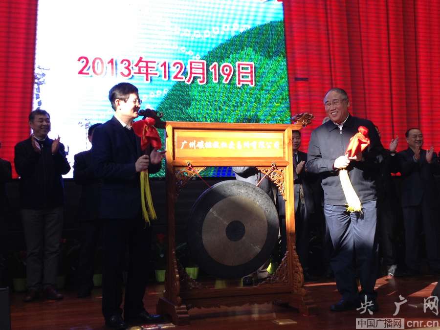國家發(fā)展改革委副主任解振華和廣東省委常委、常務(wù)副省長徐少華在廣州碳排放權(quán)交易所共同敲響了碳排放權(quán)交易市場開市鑼,標(biāo)志著廣東省碳排放權(quán)交易市場正式啟動(dòng)。(央廣網(wǎng)發(fā) 何偉奇 攝)