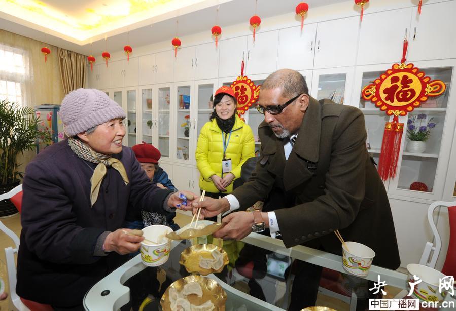 “洋志愿者”bala與老人們一起開心的吃餃子過小年(央廣網發 解琛 攝)