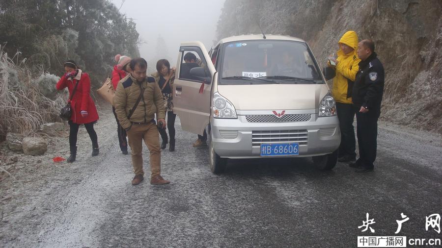 柳州融水縣桿洞鄉(xiāng)高強村打鳥坳路段路面結(jié)冰,交警轉(zhuǎn)移乘客(央廣網(wǎng)發(fā) 曹媛媛攝)