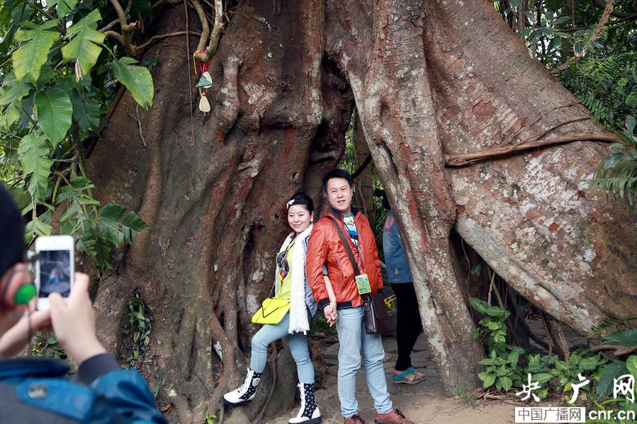 央廣網海口2月14日消息(記者許云 通訊員馬磊斌 胡立前)2月14日,中國元宵節巧遇西方情人節,眾多游客走進海南呀諾達景區游山玩水,樂享天然氧吧,共度浪漫溫馨情人節。當天上午,記者在景區哇哎嚕(海南話:我愛你)觀海平臺、千年夫妻榕、幸福天道、等寓意愛情的景點發現大批情侶聚集,開心的與充滿愛情元素的景觀自拍合影,大曬幸福,享受甜蜜休閑時光。