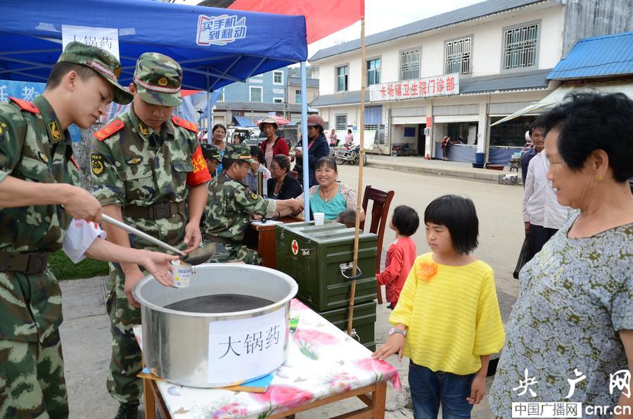 央廣網德宏5月26日消息(記者李健飛 通訊員肖林 龔建新)“這大鍋藥味道苦中帶甜,有消暑防疾病、抗疲勞的功效。”5月26日上午,云南盈江地震災區一些群眾排隊領取云南邊防醫療隊熬制的“大鍋藥”。近日盈江地震災區持續高溫炎熱,為了防范疾病,由云南邊防派出的抗震救災醫療服務隊這幾天一直奮戰在盈江“5.24”抗震救災的第一線。