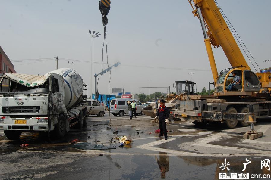 根據現場初步勘查,事故極有可能是攪拌車駕駛人為避讓右轉大貨車緊急向右打方向,致使其側翻后撞到紅燈等候的1輛轎車和3輛電瓶車,造成電動車上4人受傷、攪拌車駕駛人受傷,車輛損壞嚴重。現場汽油泄漏嚴重,經過交警、消防共同努力,通過水槍沖洗、疏散群眾等方法,稀釋了空氣中汽油含量,預防了烈日天氣下火災發生。