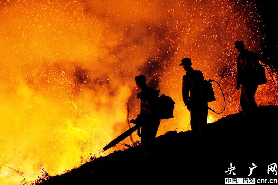 成都軍區(qū)第十四集團(tuán)軍官兵進(jìn)行撲火作業(yè)(央廣網(wǎng)發(fā) 李騰飛 攝)