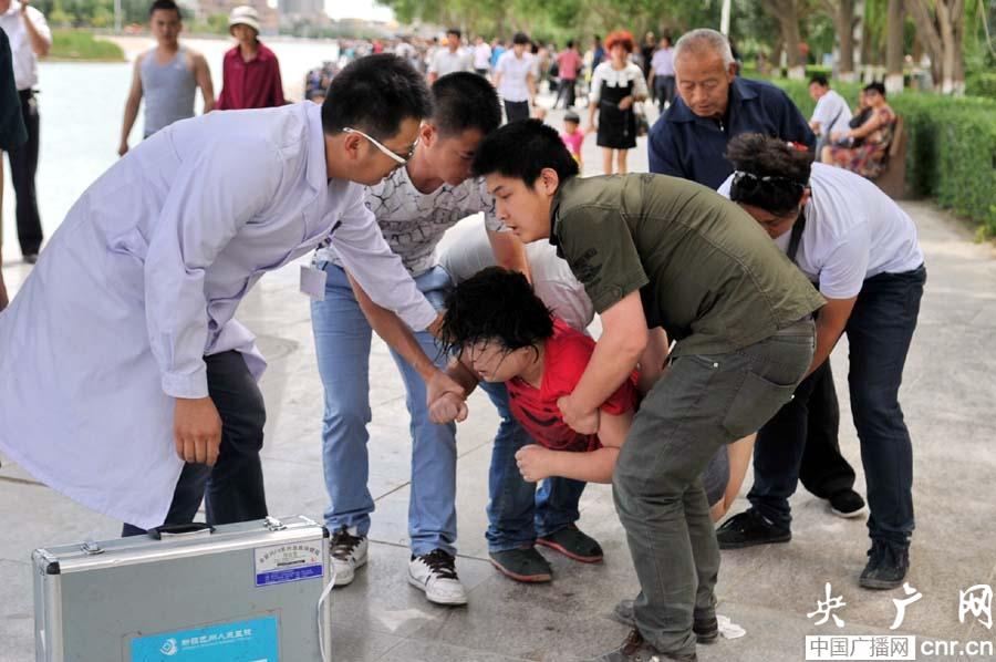 15點20分,記者聞訊趕到建設(shè)橋時,前期趕到現(xiàn)場的庫爾勒市公安消防大隊新城中隊的消防官兵正駕駛沖鋒舟在河面上搜尋失蹤的西爾艾力·艾比。河中央的小島上,被民警救起來的年輕男子茫然地看著河中的搜救官兵,而剛剛從河水中救起的女子被民警抬上岸,因為喝水太多,腹部明顯隆起很高。