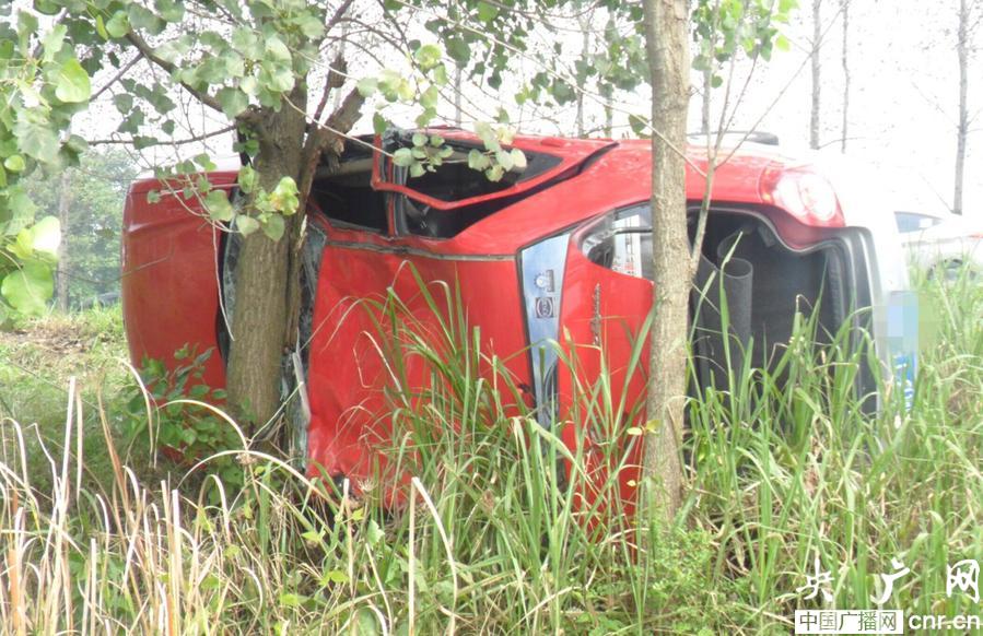 據(jù)司機(jī)張某介紹,當(dāng)日下午他正載著四位乘客沿通江大道往蕪湖市送客,車至事發(fā)路段時(shí),突然看到車子前方有一只流浪狗跑過,距離很近。張某頓時(shí)嚇了一跳,連忙猛打方向,接著就踩剎車。沒想到,這一腳剎車踩下去,車子頓時(shí)側(cè)翻并打了個滾。他們從車?yán)锱莱鰜頃r(shí),發(fā)現(xiàn)車子已經(jīng)滾到路邊撞倒行道樹上。
