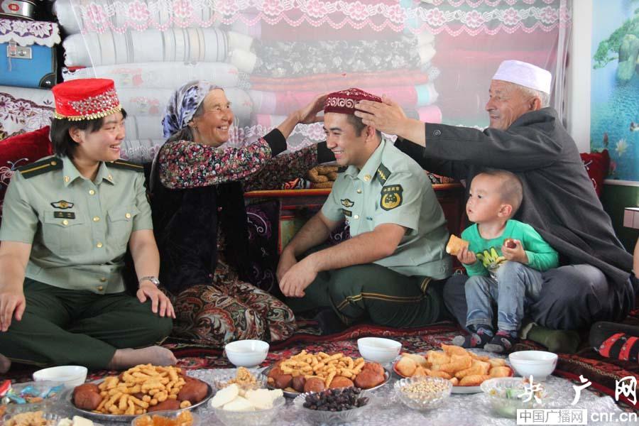 牧民黑薩甫大叔和嘉臺伊大媽為警官戴上小花帽(央廣網記者 吳卓勝 攝)