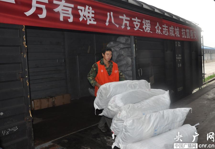成都鐵路局搶卸第一批運抵云南昭通的衣物(央廣網發 吳正琪 攝)