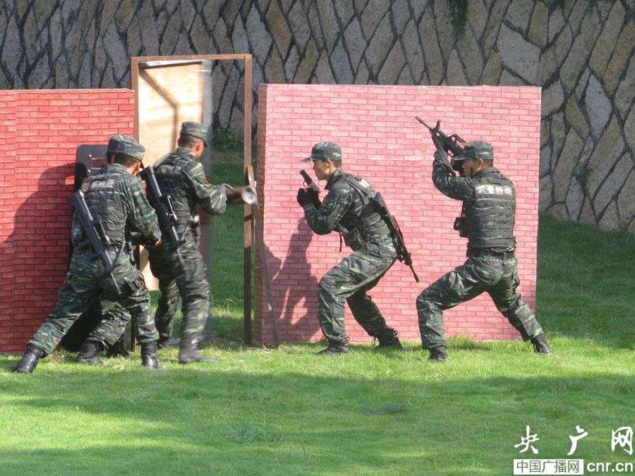 針對房屋、飛機、路面交通工具等復雜條件下的突入戰斗實彈射擊演練(央廣網記者 陳庚 攝)