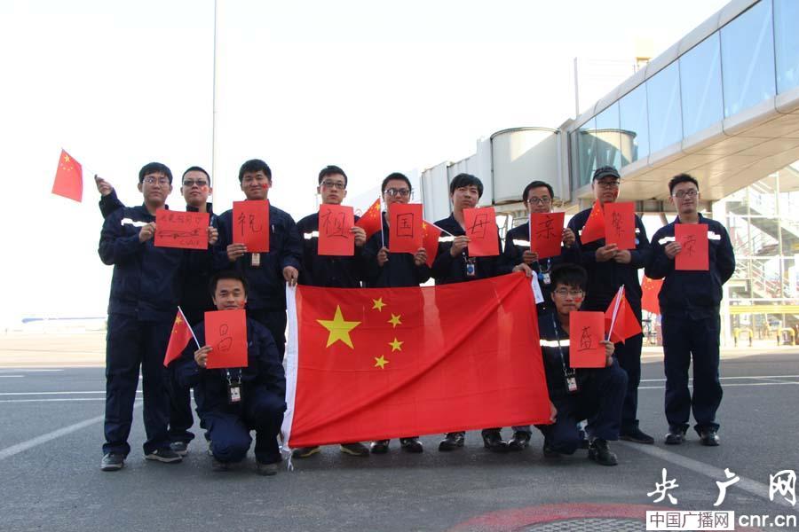一整天的揮汗如雨,小伙子們順利完成了全部定檢任務,在工作結束后,大家拿著寫滿祝福的紅紙站在國旗下合影留念。“國慶節到了,我們會認真做好每一架飛機客艙的檢查和維修,用最棒的客艙環境迎接旅客,用出色工作業績為祖國獻禮!”車間團支部書記陳峰自信地說。