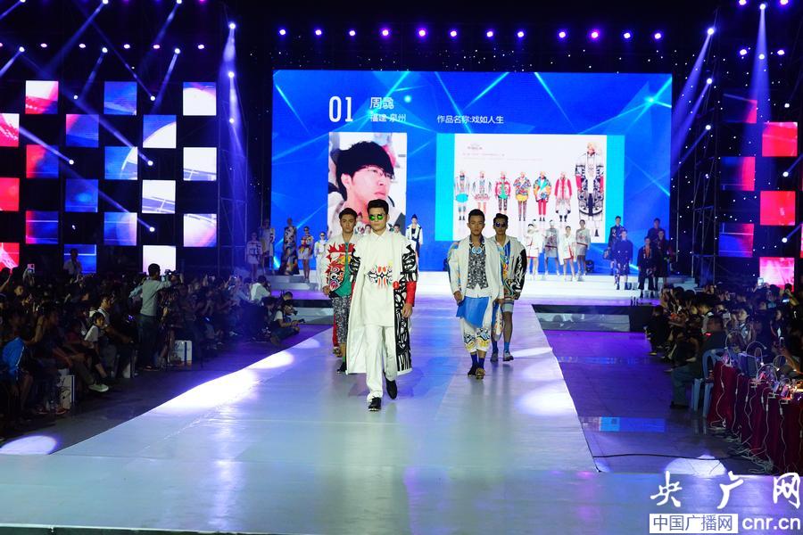 第二屆“園洲杯”全國休閑服裝設計大賽金獎1號周骉作品《戲如人生》(組委會提供)(央廣網記者 何偉奇 攝)