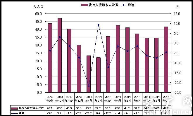 入境旅游市場小幅下降。1-3季度,接待入境游客312.9萬人次,同比下降5.9%。其中,接待港澳臺游客45.4萬人次,下降0.7%;接待外國游客267.5萬人次,下降6.7%。實現(xiàn)旅游外匯收入33.3億美元,同比下降5.9%。