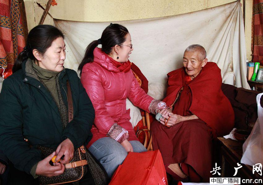 在繞賽社區(qū)的居民大院中,年過八十高齡的益西卓瑪老人告訴記者,這些工作隊隊員正是在挨家挨戶為社區(qū)內(nèi)的孤寡老人送東西。益西卓瑪老人緊握起工作隊的隊員的雙手對記者說:“考慮到現(xiàn)在年底將至,氣溫急降,這些孩子們特意為我們這些無依無靠的老人們精心購置棉絮被、毛毯、酥油、糌粑這些過冬的生活用品。平時里他們?yōu)槲覀冝k的特殊門診卡給我們徹底解決了看病的問題,又在過年前給我們添置年貨,他們就像我們的孩子一樣親。”