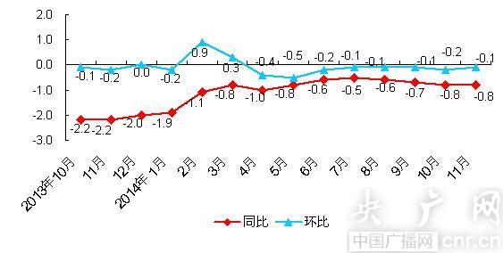 央廣網北京12月11日消息(記者李單)記者從北京市統計局、國家統計局北京調查總隊了解到,11月份,北京市工業生產者出廠價格同比下降0.8%,降幅與上月持平,環比下降0.1%;工業生產者購進價格同比下降2.8%,降幅比上月擴大0.7個百分點,環比下降0.9%。