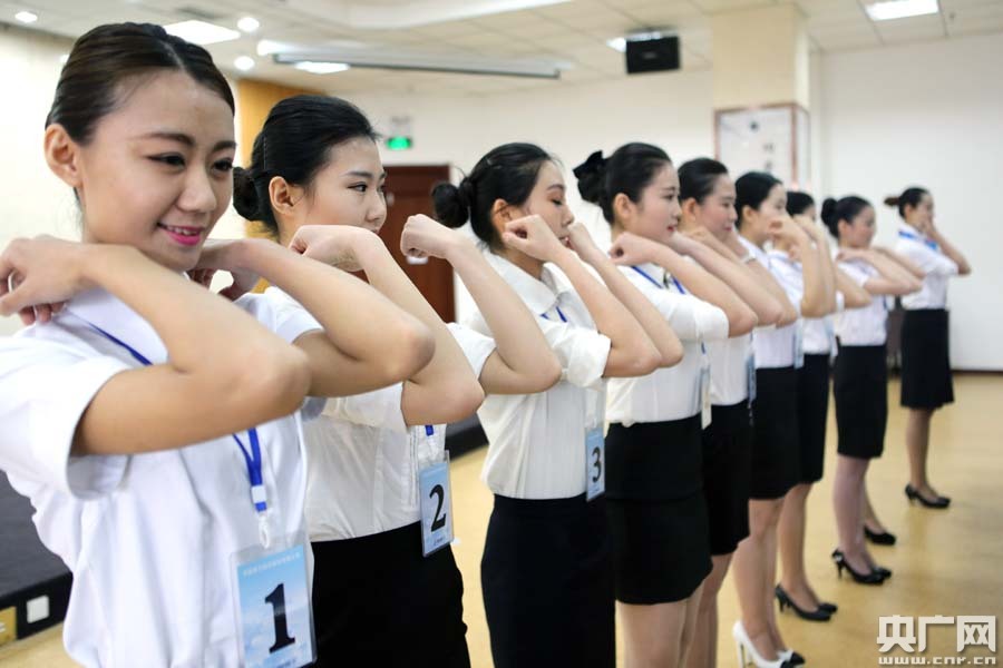 復試階段主要對應聘者外語水平、表達能力、綜合形象進行進一步考察,外語標準、具親和力的應聘者更易獲得評委青睞。應聘者進入考場前,需挽起袖口露出小臂,女性應聘者要求著裙裝。工作人員介紹,復試中,除了考察外語水平,還要檢查是否有明顯疤痕、明顯“O型腿”等。由于空姐外在形象是帶給旅客的第一感受,有紋身的應聘者自然難以通過復試。在現場,1995年出生的小張就因為手上有明顯紋身,主動放棄了復試。