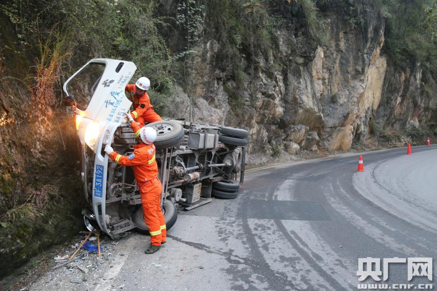 央廣網重慶11月1日消息(記者 劉湛 通訊員 宋林汶)今天清晨6時48分,重慶巫溪縣城廂鎮墨斗村省道201路段急彎處,一輛從巫溪縣上磺鎮開往巫溪縣城方向的輕型貨車失控發生側翻撞向路邊山坡,車上2人被困。巫溪縣消防大隊接到報警電話后,迅速出動一輛搶險救援車、6名消防官兵趕往現場救援,消防官兵到場后將車上2名被困人員成功救出,事故造成1人死亡、1人受傷。
