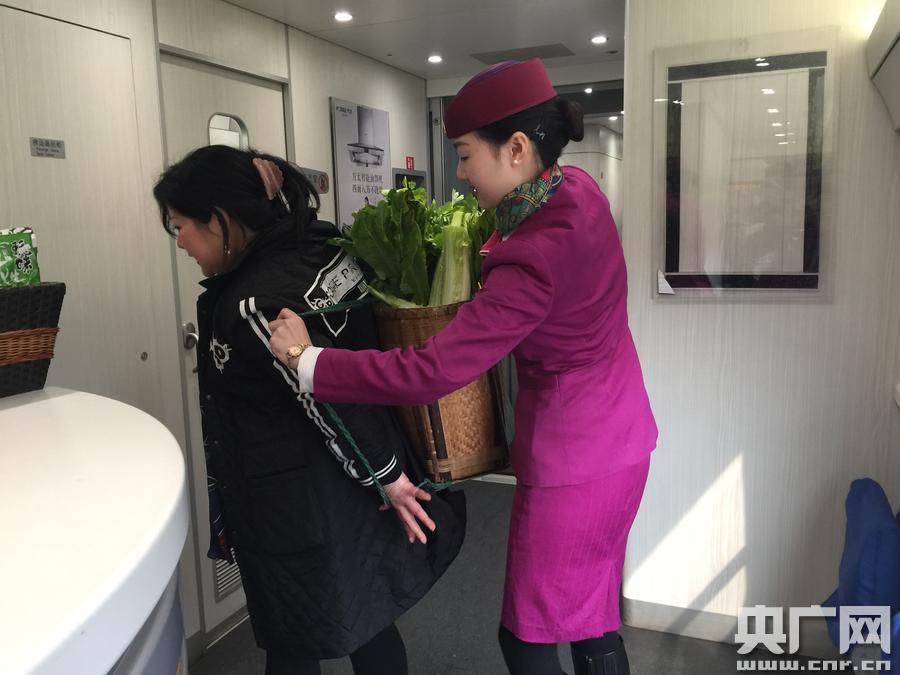 2月18日,家住資中的羅女士乘坐10點11分途經資中北站的G8508次列車到成都看望兒子?粗龜y帶滿滿一背簍的新鮮蔬菜,乘務員立即搭手幫她取下,乘務員熱心的幫忙,讓羅女士侃侃而談!艾F在你們這高鐵太方便了,我以前坐大巴要兩個多小時,現在坐高鐵半個多小時就到了!我上午從資中買的菜,中午就可以拿到成都做午飯了,真好!”