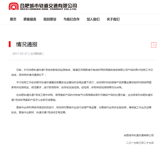 央廣網(wǎng)合肥3月28日消息(記者徐鵬)日前,針對合肥軌道交通1號線雜散電流監(jiān)測電纜、隧道區(qū)間疏散指示電線所用陜西奧凱電纜有限公司產(chǎn)品的再次檢測工作已完成。3月27日傍晚,合肥城市軌道交通有限公司在其官方網(wǎng)站發(fā)布《情況通報》: