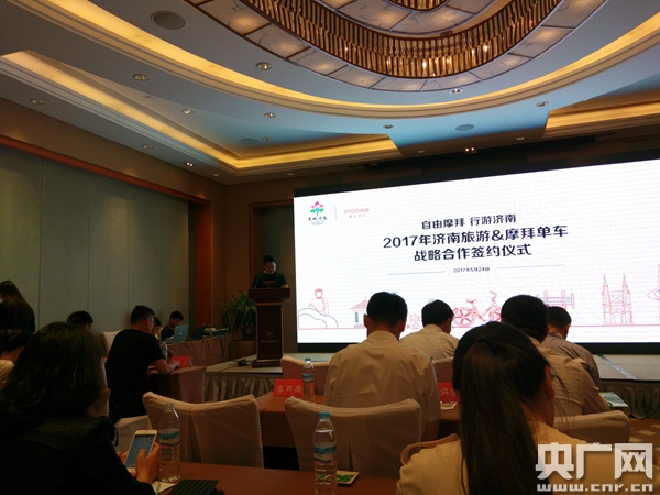 央廣網濟南5月24日消息(記者林彥銀 通訊員蘭路蕾)5月24日,濟南市旅游發展委員會與摩拜單車戰略合作協議簽約儀式在濟南喜來登酒店舉行。會上,濟南市旅游發展委員會和摩拜單車共同開啟“自由摩拜 行游濟南”整合營銷系列活動,主要包括面向五大濟南旅游客源地城市摩拜單車用戶開展的“摩拜達人騎游濟南”活動和面向全國摩拜單車用戶開展的“游濟南地標 贏旅游大獎”活動;顒油趯⒋蛟炷Π葜黝}郵局、摩拜主題酒店客房,并發布“濟南五大騎行線路”。