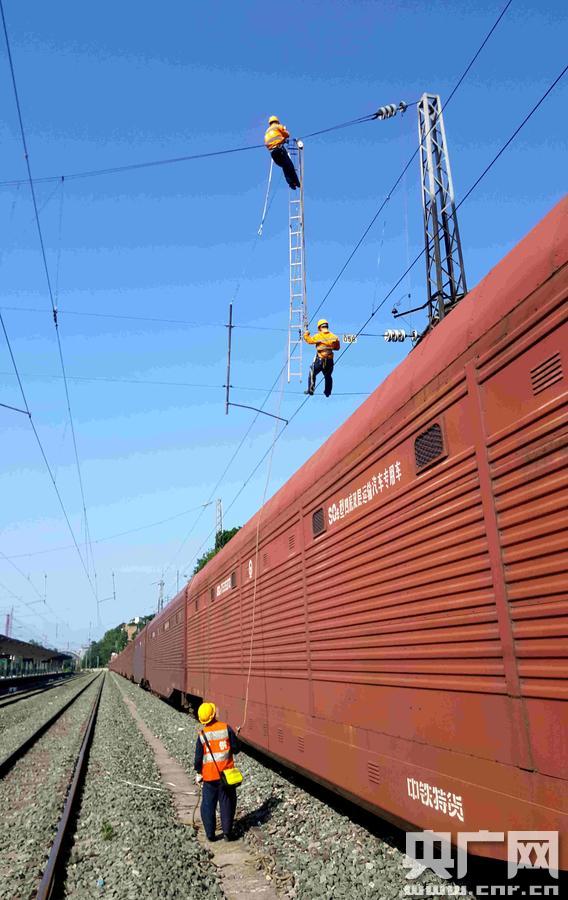 成都供電段宜賓接觸網檢修工區職工在宜賓站更換吊弦場景(央廣網發 駱峰 攝)