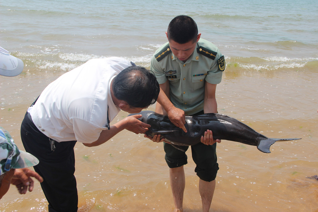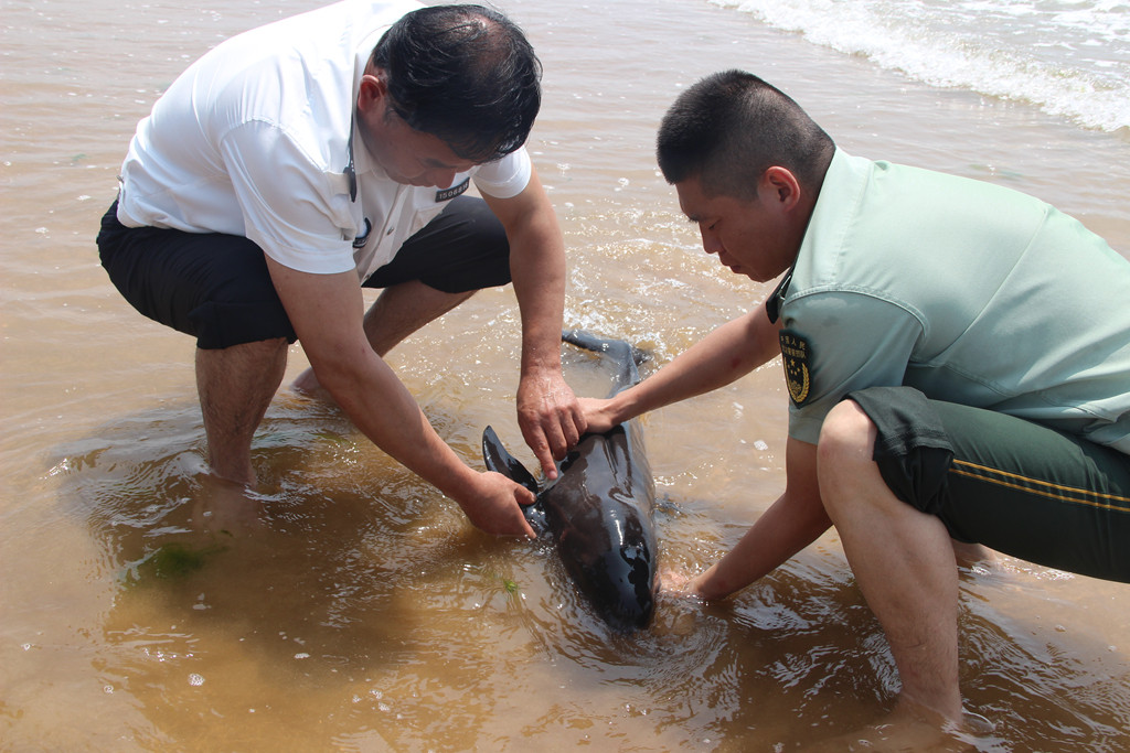 據介紹,漁民在大辛家附近海域發現該江豚時,因長時間的擱淺和強紫外線照射,江豚已難以動彈。經過相關救援人員的初步檢查和判斷,這頭江豚體長約1米5,大概一歲左右,身上有輕微的擦傷,但是不會對健康造成影響,符合放生基本條件。對此,派出所民警聯合海陽漁政工作人員協力將江豚拖進大海放生。