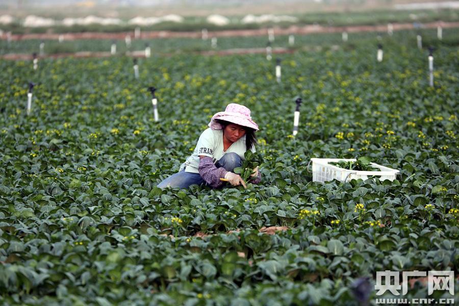 •      在菜芯地里辛勤地勞作(央廣網記者 郭長江 攝)
