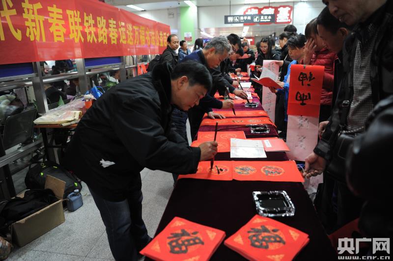 “紅桃賀歲杏迎春,丹鳳呈祥龍獻瑞”旅客分別拿著書法家寫給自己的對聯拍照留念,送春聯活動現場一派喜氣洋洋。來自江西的姚女士帶著一歲多的女兒拿著紅紅火火的“福”字,高興地對記者說:“沒想到在返鄉的途中,還有書法家親自送春聯,我心里感到特別快樂和溫暖。”來自湖南衡陽的男孩小陳說:“我一年都沒回老家看望父母了,給父母帶一副書法家寫的對聯,他們肯定喜歡。”細心的記者發現靦腆的小陳歡喜的明眸里竟有淚花在閃。“春滿乾坤福滿門,天增歲月人增壽”書法家很快揮毫,把新年的祝福送給小陳遠方的父母。從上午9點至16點,書法家們共為旅客和鐵路職工書寫、送出對聯500多幅,送出“福”字500多個。為2018年春運旅客安全、平安、溫馨出行增添了喜慶溫暖的氣氛。