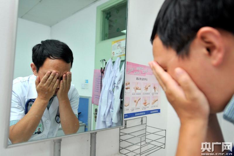 圖為疲憊不堪的羅醫生利用交辦前的空隙洗臉 (央廣網發 通訊員李韻熙 陶繼東)
