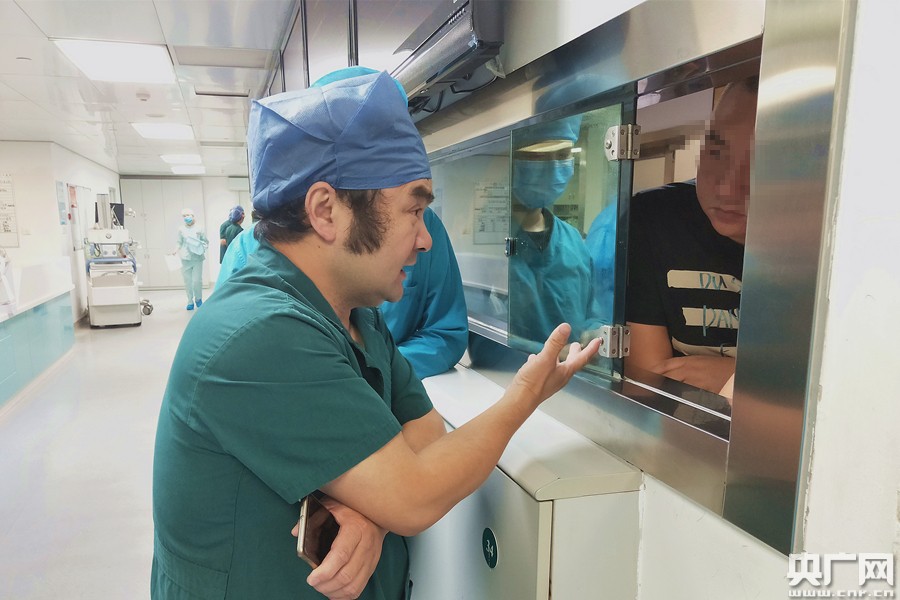 圖為余主任在與患者家屬溝通 (央廣網記者 黃炎秋 攝)