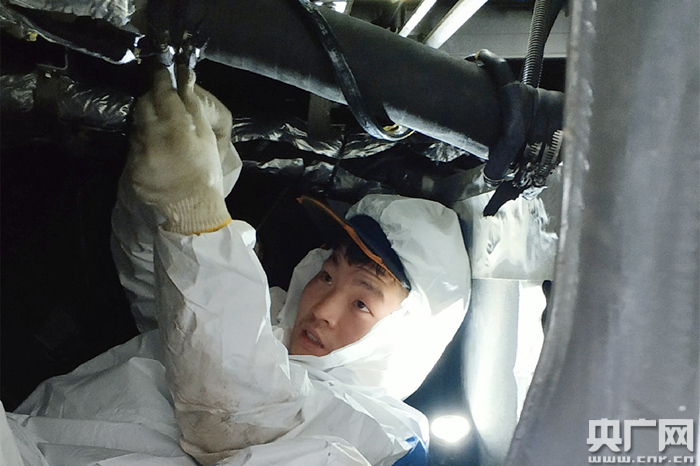 動車組機械師王占軍蜷縮在動車設備艙內處理故障(央廣網發 通訊員施為 攝)