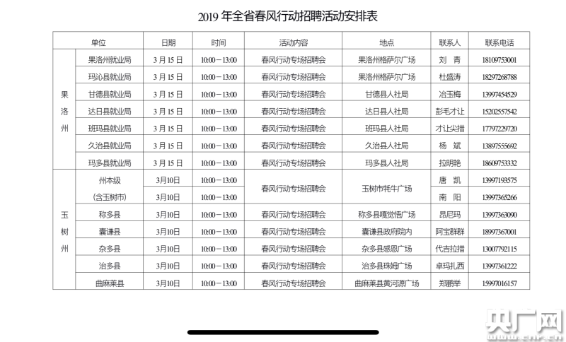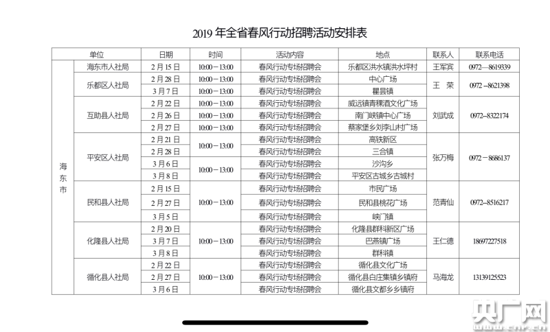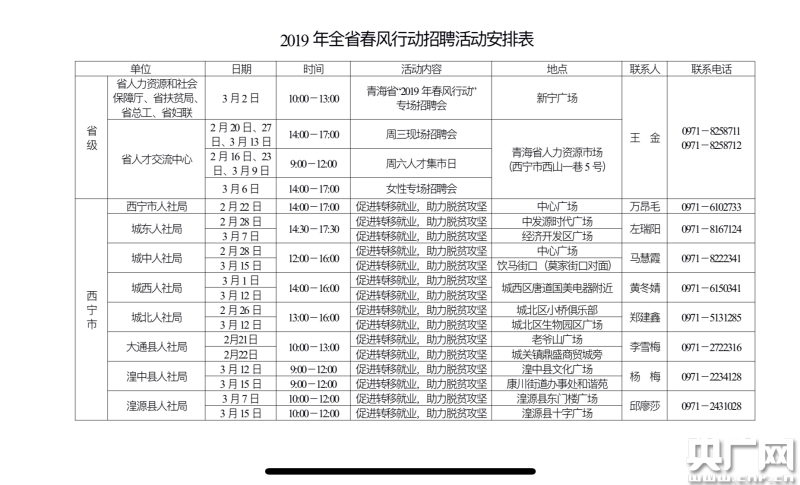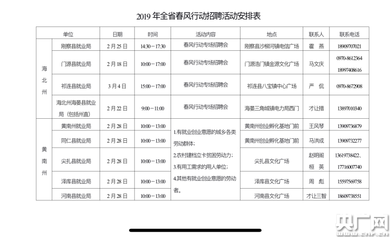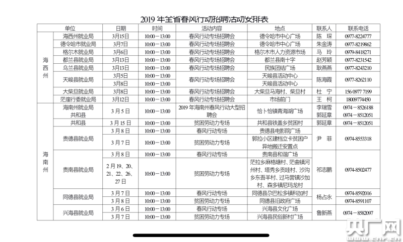 青海省內(nèi)兩市六州將于3月中旬前在當(dāng)?shù)嘏e辦“春風(fēng)行動(dòng)行動(dòng)專場(chǎng)”、“貧困勞動(dòng)力專場(chǎng)”等多場(chǎng)招聘會(huì),廣大求職者及用人單位可踴躍參加。