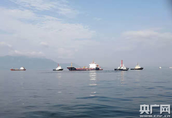 失控船“常豐油12”輪在四艘拖輪拖帶、海事執(zhí)法船全程護航下起錨進港。(圖片由惠州海事局提供)