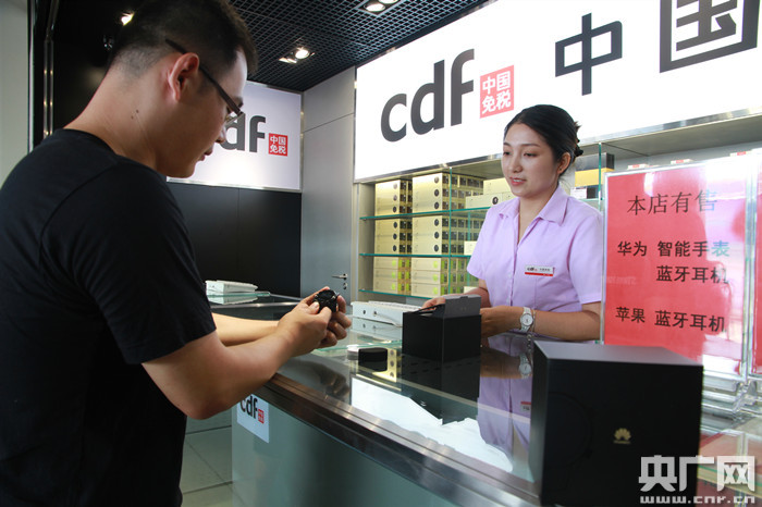 央廣網(wǎng)珠海9月4日消息(記者郭翔宇 通訊員萬學(xué)玲 蔡蒙蒙)日前,位于拱北口岸中免出境免稅店的國產(chǎn)品退稅專柜通過海關(guān)實(shí)地驗(yàn)收,正式對外銷售。當(dāng)天晚上,一名內(nèi)地旅客在專柜購買了一個華為智能手表,退稅后價格1267元港幣,成為專柜首位顧客。