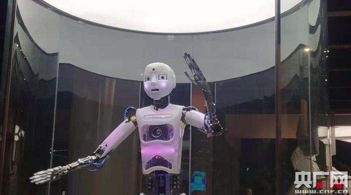 人形機器人小羅正在演唱歌曲《我和我的祖國》,眼神、手勢、身姿都惟妙惟肖。(央廣網記者 劉陽 攝)