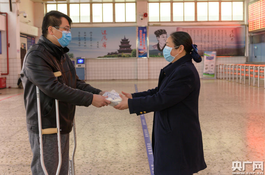 據該站客運車間主任雷志超介紹,這是周熙亮第3次拄著拐杖給車站職工送來防疫物資,前面兩次已分別接受了他捐贈的60副手套、1000個口罩。職工每次聞訊后都在微信里為他點贊。