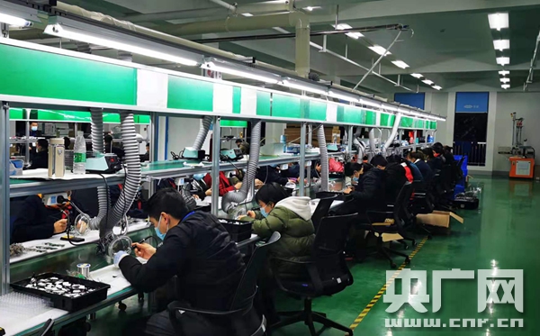 在防疫物資生產線上,工人們緊張進行生產。(央廣網發 長沙雨花經開區供圖)