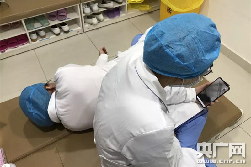 連續工作了16個小時后,歐陽艷玲(左)躺在換鞋凳上休息,身旁另一位護士何婷珊正在同女兒視頻。(央廣網發 通訊員供圖)