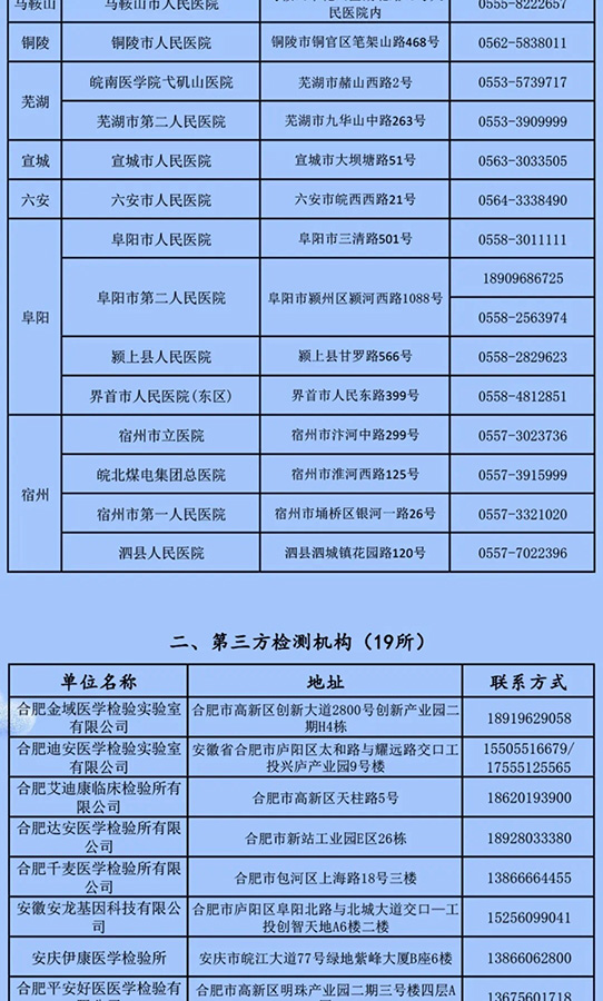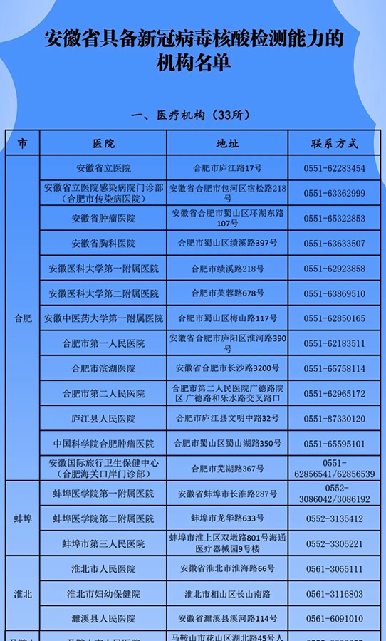 央廣網合肥5月2日消息(記者王利)日前,安徽省衛健委公布具備新冠病毒核酸檢測能力的機構名單,其中醫療機構33家,第三方機構19家。