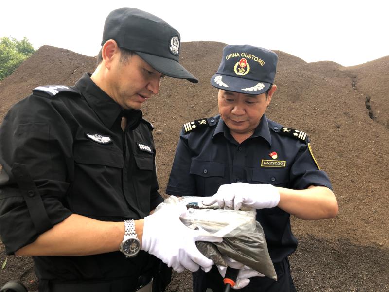 昆明海關關警員在對走私入境固體廢物取樣(央廣網發 昆明海關供圖)