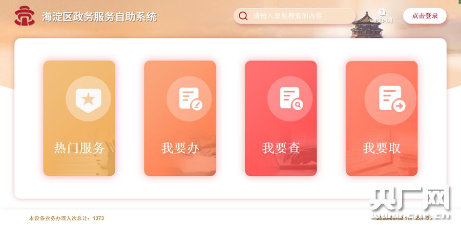 海淀自助服務終端集查詢、事項申報、人證核驗、打印、存取件等為一體,包含“熱門服務、我要辦、我要查、我要取”四大功能模塊,業務范圍涵蓋市級自助服務事項、區綜合大廳綜窗事項、區級與街鎮網辦事項以及高頻主題事項。這是在全市首次實現自助政務服務業務全觸達、政務服務形式全覆蓋及收件與實際辦理相結合。