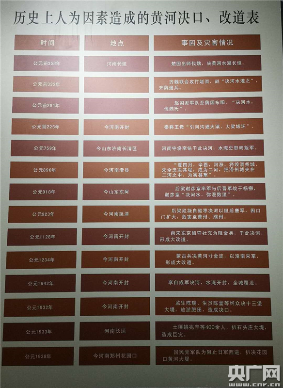《歷史上人為因素造成的黃河決口、改道表》, 自先秦至民國的近3000年間,黃河平均“三年兩決口,百年一改道”。明代和清代尤其嚴重。“道光二十三,洪水漲上天。沖走太陽渡,捎帶萬錦灘。”這首陜縣民謠,形象反映了清朝道光年間黃河水泛濫成災的現象。(總臺央廣記者 任磊萍 攝)