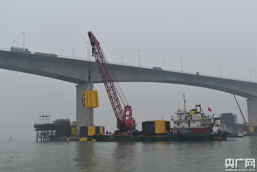 肇慶大橋防撞工程安裝浮箱作業現場(央廣網發 肇慶海事局供圖)