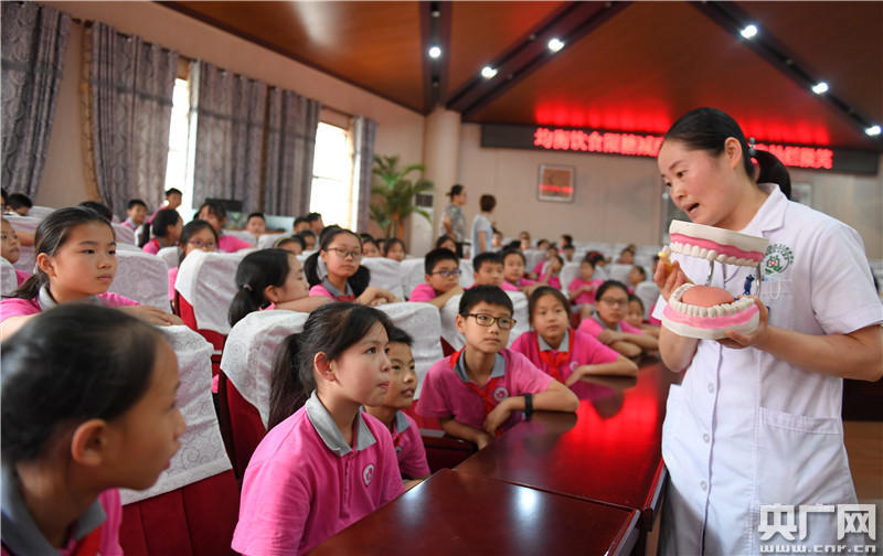 醫生正在向同學們講解正確的護牙方式。(央廣網發 蘇玲攝)