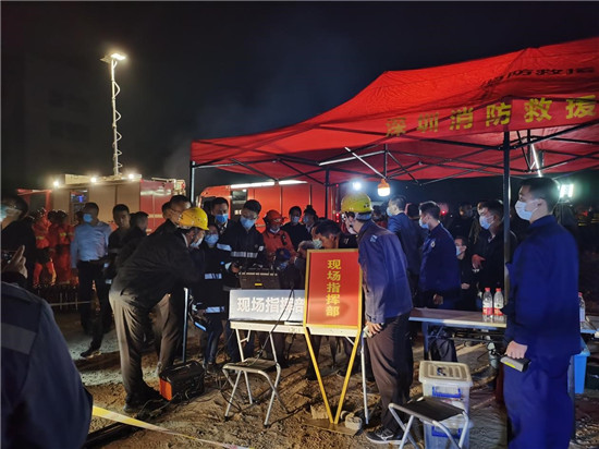 23時許深圳公益救援隊已在附近集合時刻準備支援,他們主要負責救援協助、物資保障等支援工作。凌晨12時30分許,多輛泡沫消防車進入救援現場,與此同時,新一批的深圳公益救援隊已經集結!