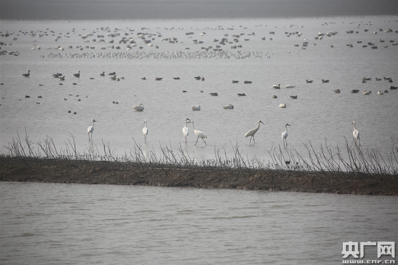 沉湖濕地拍攝到的7只白鶴,遠處還有小天鵝、豆雁和反嘴鷸(央廣網發 武漢市蔡甸區沉湖濕地自然保護區管理局工程師馮江供圖)