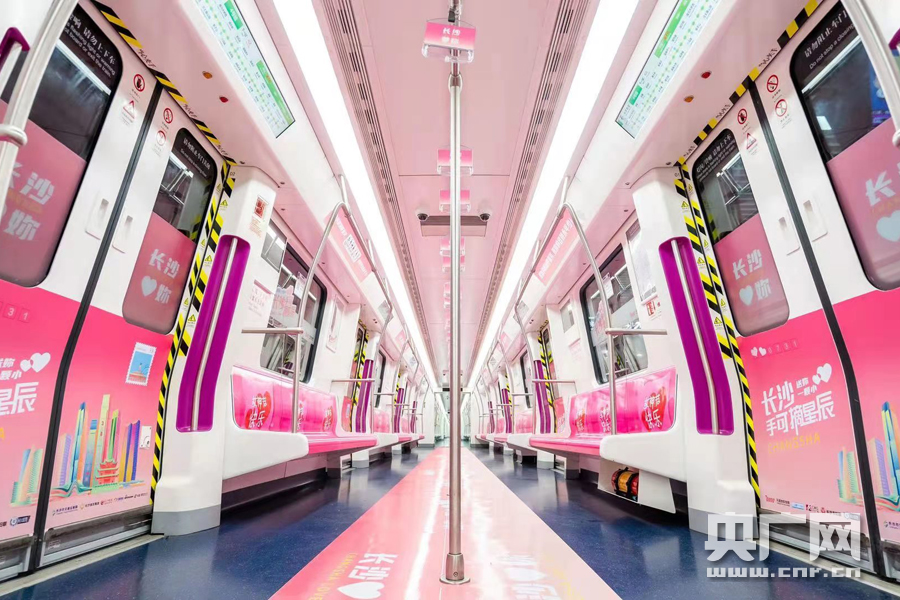 網友們發現“長沙整座城市都是粉粉噠”:長沙地鐵3、4、5號線都推出了各自的粉紅專列,地鐵4號線的座椅還被刷成了粉紅色,地鐵的語音播報還做了特別定制。長沙的38路公交車推出了粉紅專車,隨處可見的出租車頂燈也變成了粉紅色,并播放“長沙手可摘星辰”等字樣。
