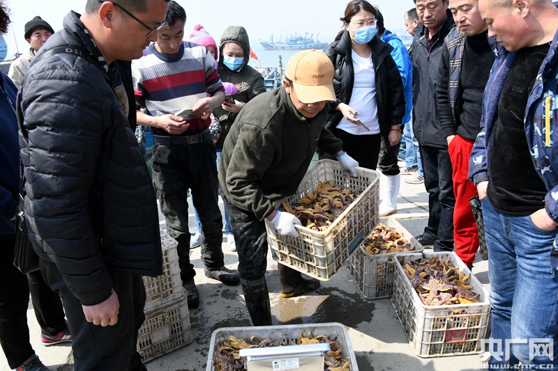 3月14日,紅島漁港碼頭,收購商在稱重收購剛剛到港上岸的海星。(央廣網記者 王偉 攝)
