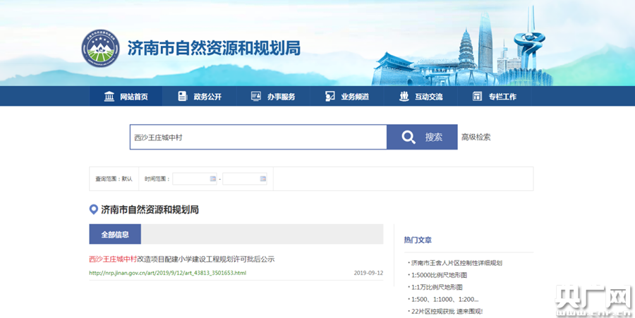 記者檢索發現,在濟南市自然資源和規劃局官網上,該樓盤所屬建設地塊西沙王莊城中村改造項目的查詢信息中,未查詢到“中學建設規劃公示”的相關信息。